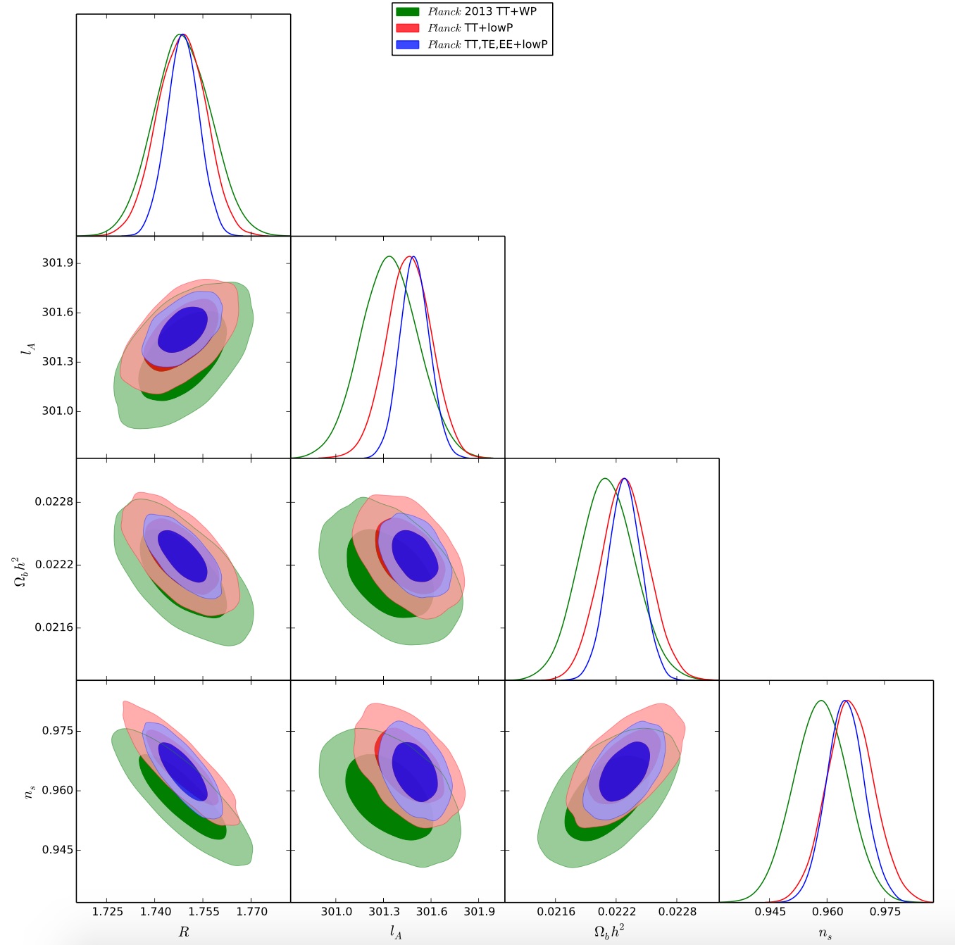 采用宇宙学蒙特卡洛马尔科夫链(CosmoMC)的方法拟合数据组发布的似然数据点可以限制宇宙学模型参数。如果仅仅局限于研究暗能量的性质,有时并不需要用全局拟合的方法,而仅需计入一些约化的特征参数,比如distance priors {R, l_A, Omega_b h^2, n_s},其中R表征声学峰的幅度,l_A表征声学峰的结构。2015年2月,普朗克合作组发布最新的科学结果,但是并没有同时发布微波背景辐射极化的似然数据。在arXiv:1502.01590中,普朗克合作组仅仅利用TT+lowP的数据重构出distance priors。最近普朗克合作组公开了极化的数据。我们采用了所有的普朗克观测数据(包括极化数据)重构了distance priors。我们的结果比普朗克合作组结果的精度改进了30%~40%。见图1中蓝色的轮廓线。我们的结果是迄今为止得到的最精确的distance priors。我们的结果发布到arXiv几天后,Caltech的Yun Wang及其合作者Mi Dai也得到了类似的结果(arXiv:1509.02198)。