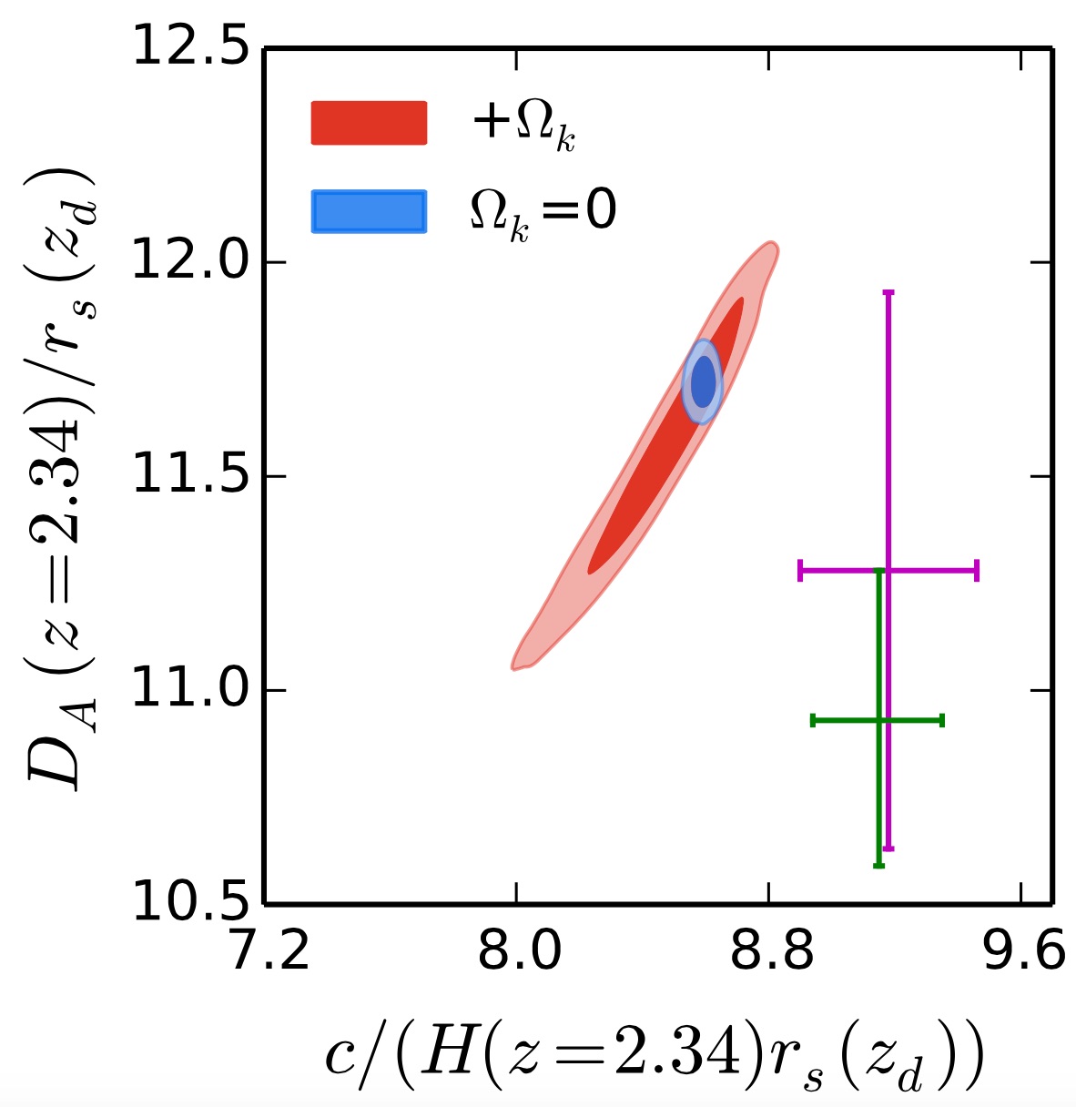 在arXiv:1509.00969中,我们将LCDM模型扩展到一般的暗能量模型,并进一步扩展到空间弯曲的宇宙模型。利用前面的到的distance priors,低红移BAO以及Union2.1超新星数据限制这两个扩展模型,并预言这两个模型在红移z=2.34的角直径距离(D_A)以及哈勃参数。见图2中蓝色和红色的轮廓线。图2中紫色和绿色“十”字型分别对应Lyalpha forest自相关的测量结果以及复合了自相关和互相关联数据得到的结果。从图2不难发现在这两个扩展模型中,普朗克的观测数据以及低红移BAO的观测数据仍然和红移z=2.34的BAO数据存在明显的不一致。可见简单的扩展LCDM宇宙学模型并不能很好的解释这几组数据之间的不一致。