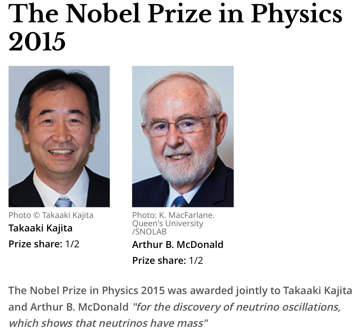 2015年诺贝尔物理奖颁发给Takaaki Kajita和Arthur B. McDonald,以表彰他们发现中微子振荡,揭示中微子具有质量。