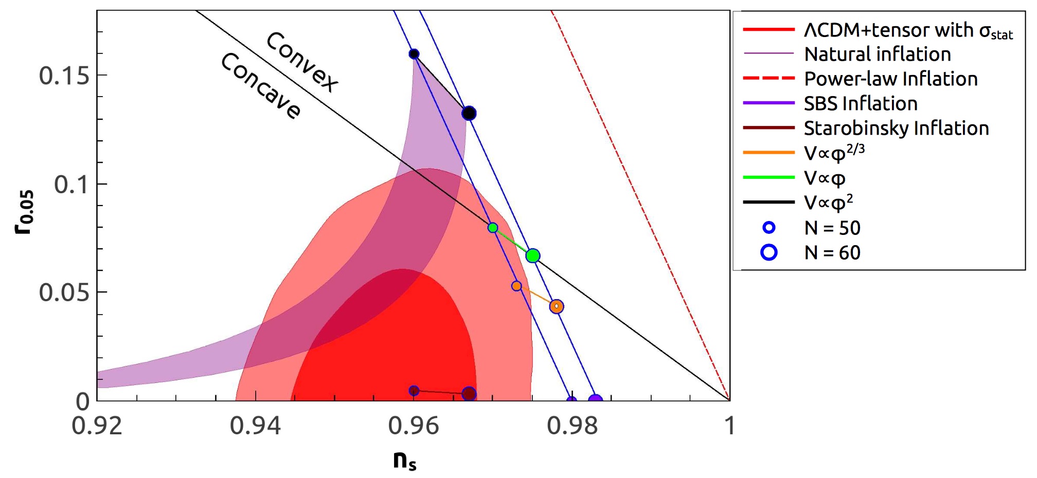 2014年3月,宇宙河外背景偏振成像(BICEP2)合作组声称他们发现了原初引力波留下来的特殊的指纹(arXiv:1403.3985)!这一发现震撼了整个基础科学界。如果这是真的,那么将无疑是基础科学领域一个突破性的进展。大家津津乐道的不是这个发现能否值诺贝尔奖的问题,而是值几个诺贝尔奖的问题。如果BICEP2探测到的信号来自原初引力波,那么张-标比(tensor-to-scalar ratio)为r=0.20(-0.05)(+0.07)。这与A. Linde提出的m^2phi^2暴涨模型的预言相吻合。因此很多人乐观的估计发现B-模极化的BICEP2小组和提出暴涨宇宙学模型的三位科学家(A. Starobinsky, A. Guth和A. Linde)分别获得诺贝尔物理奖。